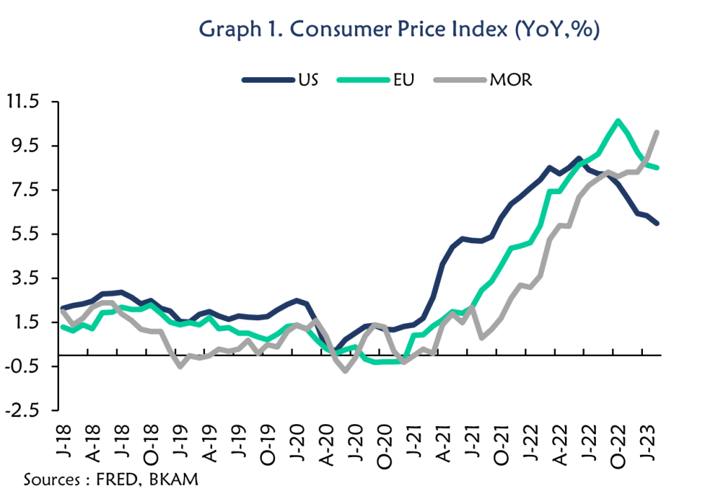 Les perspectives d’inflation mondiale restent très incertaines, les récentes fragilités financières ayant incité de nombreux observateurs à appeler à un ralentissement du cycle de hausse des taux. La récente décision de l’OPEP+ concernant les réductions signale le fonctionnement des principales mesures anti-inflationnistes des banques centrales, même si elle souligne également leur réversibilité. Ce qui est en revanche certain, c’est la progression constante et significative des niveaux de prix au Maroc. L’IPC global s’est établi à 10,1 % en glissement annuel en février 2023, un plus haut depuis 40 ans, tandis que l’inflation sous-jacente a été rapportée à 8,5 % en glissement annuel, avec une progression de 0,8 % en glissement mensuel. Les produits alimentaires ont été les principaux responsables de ces chiffres record, avec une croissance de 20,1 % en glissement annuel.