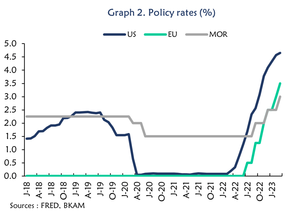 One must nonetheless recall that Bank Al Maghrib monetary policy strategy is an exchange rate targeting strategy, not an inflation one, and that given global policy rates dynamic, the central bank is constrained to mimic the movement of the two crucial currencies for the floating peg of the dirham, the euro and the dollar.