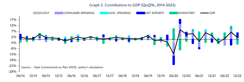 Forecasts and global cycle tend to weigh in favor of the previous view as Morocco is set to experience mild growth, in line with the stagflation tone dominating forecasts for world economies in 2023. The IMF expects global growth to fall to 2.9% in 2023, vs. 3.4% in 2022 while Morocco’s central bank forecasts a modest increase to 2.6% in 2023, up from the sluggish 1.2% in 2022. Granular data from the HCP shows clearly downward trends of both consumption (purple) and investment (grey) in Morocco’s GDP growth. Consumption’s reactions to closing and re-opening of the economy during the era of Covid lockdowns are patent, but since the return to normalcy, these shocks faded.
