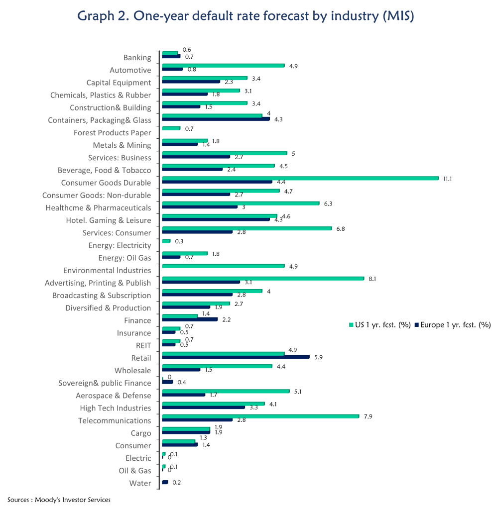 Besides, the banking sector is facing heightened risks as the economic outlook challenges the profitability of its clients. In fact, credit risk is on the rise, as evidenced in the below chart for the US and Europe. Industries such as automotive, business services, durable consumer goods, advertising or even telecommunications have seen a spike in their one-year forecasted default rate, especially in the US. Other risks such as FX risk due to geoeconomic transformation or market risk caused by record breaking volatility and markets over-sensitiveness may arise.